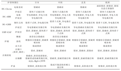 摘 要:由三根電極的普通交流電弧爐發(fā)展為超高功率(UHP)及一根電極的直流(DC)電弧爐,爐體結(jié)構(gòu)有一些改變。針對(duì)各部位的損毀因素,內(nèi)襯用的耐火材料也有所發(fā)展。例如普通電弧爐的爐頂用高鋁磚、爐墻鎂磚砌筑,而UHP及DC電弧爐采用大面積水冷爐頂、爐墻,爐頂三角區(qū)采用剛玉澆注料或預(yù)制件,爐墻用鎂碳磚,蝕損嚴(yán)重部位采用噴補(bǔ)作業(yè)。還介紹了日本等一些國(guó)家DC和UHP的各種爐型用耐火材料。煉鋼電弧爐是以電極端部和爐料之間發(fā)生的電弧為熱能進(jìn)行煉鋼的設(shè)備。電弧爐以廢鋼為爐料直接煉鋼,與礦石煉鐵后再煉鋼相比,基建投資少,節(jié)能60%、節(jié)水40%、減少?gòu)U氣排放86%、減少?gòu)U渣97%[1]。交流電弧爐歷史悠久,交流電是通過三根石墨電極輸入爐內(nèi),在電極下端與金屬料之間產(chǎn)生電弧,利用電弧高溫直接加熱爐料,使煉鋼過程得以進(jìn)行。供電功率越高,爐料熔化速度越快,降低能量消耗越多,因此出現(xiàn)超高功率(UHP)電弧爐。在超高功率的基礎(chǔ)上發(fā)展了直流(DC)電弧爐煉鋼。直流電弧爐是以一根石墨電極的端點(diǎn)為陰極,爐底為陽(yáng)極,石墨電極位于爐膛中心部位。與UHP相比設(shè)備結(jié)構(gòu)簡(jiǎn)單,建設(shè)費(fèi)用低,熔池中的電流與熱量分布比較均勻,不存在過熱區(qū)域,因此耐火材料損耗比較小、節(jié)能且噪音小等。目前,煉鋼電弧爐向大型化、控制自動(dòng)化方向發(fā)展。我國(guó)的電弧爐主要用來生產(chǎn)合金鋼。煉鋼水平與工業(yè)發(fā)達(dá)國(guó)家相比差距較大,如2015年我國(guó)電爐鋼占粗鋼總產(chǎn)量的6.1%,2020年有所提高,但也不超過10%,與世界平均水平的30%相比還有較大差距。我國(guó)已經(jīng)引進(jìn)先進(jìn)水平的UHP和DC電弧爐,隨著經(jīng)濟(jì)發(fā)展,工業(yè)化程度提高,必然伴以廢鋼資源數(shù)量增加,同時(shí)發(fā)展鐵礦石直接還原煉鐵技術(shù),代替廢鋼,增加電弧爐煉鋼的爐料,還有核電的發(fā)展,使電弧爐煉鋼有了物質(zhì)保證。電弧爐的內(nèi)襯是耐火材料構(gòu)成的,隨著UHP和DC技術(shù)的發(fā)展,需要新型優(yōu)質(zhì)耐火材料與之相配套。有人說[2]:沒有優(yōu)質(zhì)爐襯、爐底耐火材料支持長(zhǎng)壽爐齡,超高功率電弧爐就無法發(fā)揮高效生產(chǎn)的優(yōu)勢(shì)。爐底耐火材料是直流電弧爐得以實(shí)現(xiàn)的必要條件,反映了煉鋼與耐火材料技術(shù)的互相影響,互為依存,在電弧爐煉鋼系統(tǒng)優(yōu)化生產(chǎn)中有不可分割的作用。1 電弧爐的結(jié)構(gòu)變化傳統(tǒng)的電弧爐由爐頂(又稱爐蓋)、爐墻、爐坡、爐底和出鋼槽構(gòu)成,全部用耐火材料構(gòu)筑,外包鋼制爐殼。爐墻一側(cè)設(shè)有爐門,另一側(cè)為出鋼口,并與出鋼槽相連。而UHP和DC電弧爐采用偏心爐底出鋼,使?fàn)t體由傾動(dòng)式改為固定式,爐底有供氣攪拌設(shè)置,爐頂安裝氧-燃料燒嘴,在爐底偏心位置設(shè)置出鋼口,代替出鋼槽。由于取消了傾動(dòng)設(shè)備,擴(kuò)大了水冷面積,緩和了爐襯的損毀,適當(dāng)降低了出鋼溫度,并縮短了出鋼時(shí)間,從而降低生產(chǎn)成本。爐墻采用鑲砌水冷箱式水冷套措施,其內(nèi)表面噴涂一層耐火涂料,使其掛渣形成保護(hù)層,可有效降低耐火材料消耗,但電耗可能增加。國(guó)外有的電弧爐功率達(dá)1 000 kV·A/t以上,爐墻壽命達(dá)2 000爐次以上,水冷爐蓋壽命達(dá)4 000爐次,降低耐火材料消耗60%以上。2 耐火材料內(nèi)襯的損毀因素電弧爐內(nèi)襯的耐火材料長(zhǎng)期處于高溫、熔渣侵蝕和急熱急冷狀態(tài)下,工作條件極其惡劣。在煉鋼的熔化期和氧化期,不致于因高溫?fù)p壞爐襯,但在還原期的鋼液溫度相當(dāng)高,又受電弧直接輻射(有時(shí)溫度達(dá)4 000℃以上),爐襯很容易造成熔融損壞。出完鋼裝料時(shí),爐襯溫度突然下降,裝完料開始送電,溫度又逐漸升高,這種急冷急熱是爐襯剝落的直接原因,主要是爐頂容易剝落。耐火材料內(nèi)襯損毀的主要因素包括[3]:(1)化學(xué)侵蝕。FeO或渣中SiO2與耐火材料中的CaO、MgO之間的化學(xué)反應(yīng),使?fàn)t襯變?yōu)槿墼鴮?dǎo)致?lián)p毀。(2)耐火材料內(nèi)襯中的碳成分被含氧成分(如FeO、O2、MgO等)氧化,導(dǎo)致耐火材料脫碳而損毀。(3)沖刷和機(jī)械沖擊。鋼水或熔渣流過耐火材料表面,以物理性磨損或沖刷爐襯,而導(dǎo)致內(nèi)襯損毀;在出鋼口、渣線、電極口或排氣口平臺(tái)等沖刷嚴(yán)重,廢鋼等爐料吊入往往撞擊爐襯而損毀。(4)水化。在生產(chǎn)過程中,往往會(huì)出現(xiàn)爐頂或爐墻漏水或滲水,還有水蒸氣,與堿性耐火材料中的MgO、CaO進(jìn)行水化反應(yīng),使內(nèi)襯損毀。3 電弧爐用耐火材料根據(jù)電弧爐的結(jié)構(gòu),由于各部位承受的熱負(fù)荷大小不同,與熔渣、鋼水接觸作用及機(jī)械損壞程度存在差異,不同部位必須采用不同的耐火材料[4]。3.1 爐頂(蓋)我國(guó)中小電弧爐普遍采用燒成或不燒高鋁磚,局部用高鋁質(zhì)或剛玉質(zhì)不定形耐火材料預(yù)制件。大型超高功率電弧爐和直流電弧爐采用水冷技術(shù),除三角區(qū)外,爐頂耐火材料不是關(guān)鍵。三角區(qū)由于強(qiáng)烈熱震及電極熱輻射苛刻,國(guó)外普遍采用剛玉質(zhì)或鋁鉻質(zhì)